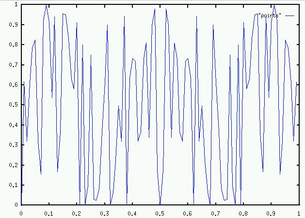x := λ x (1-x)for certain values of λ (lambda) and certain starting values of x in the range: