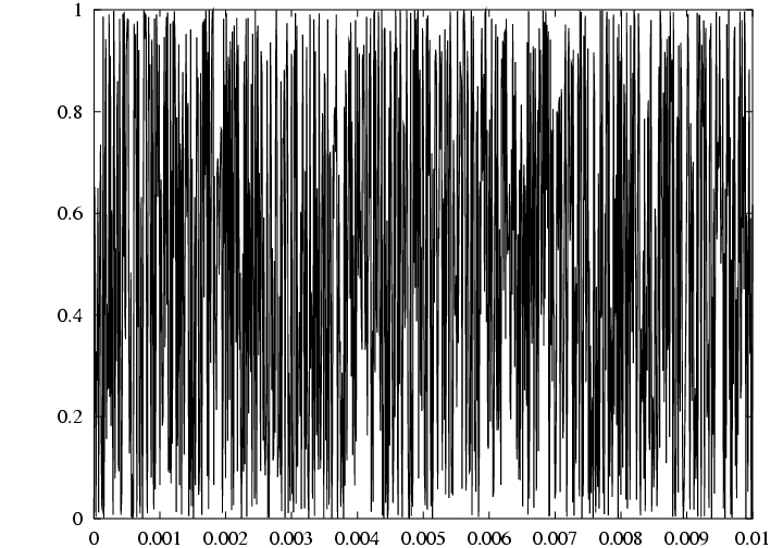 If the starting value of x is 0.75 it will stay at that value forever. However, other starting values (apart from the unusual special cases just listed) do not converge to 0.75, or indeed to anything, e.g. try starting at x = 0.7. You will see that values bounce around randomly in the interval between 0 and 1 forever. The length of the attractor cycle has gone to infinity. Even try starting at x = 0.7501. You will see that it will rapidly diverge from 0.75, and never go back.