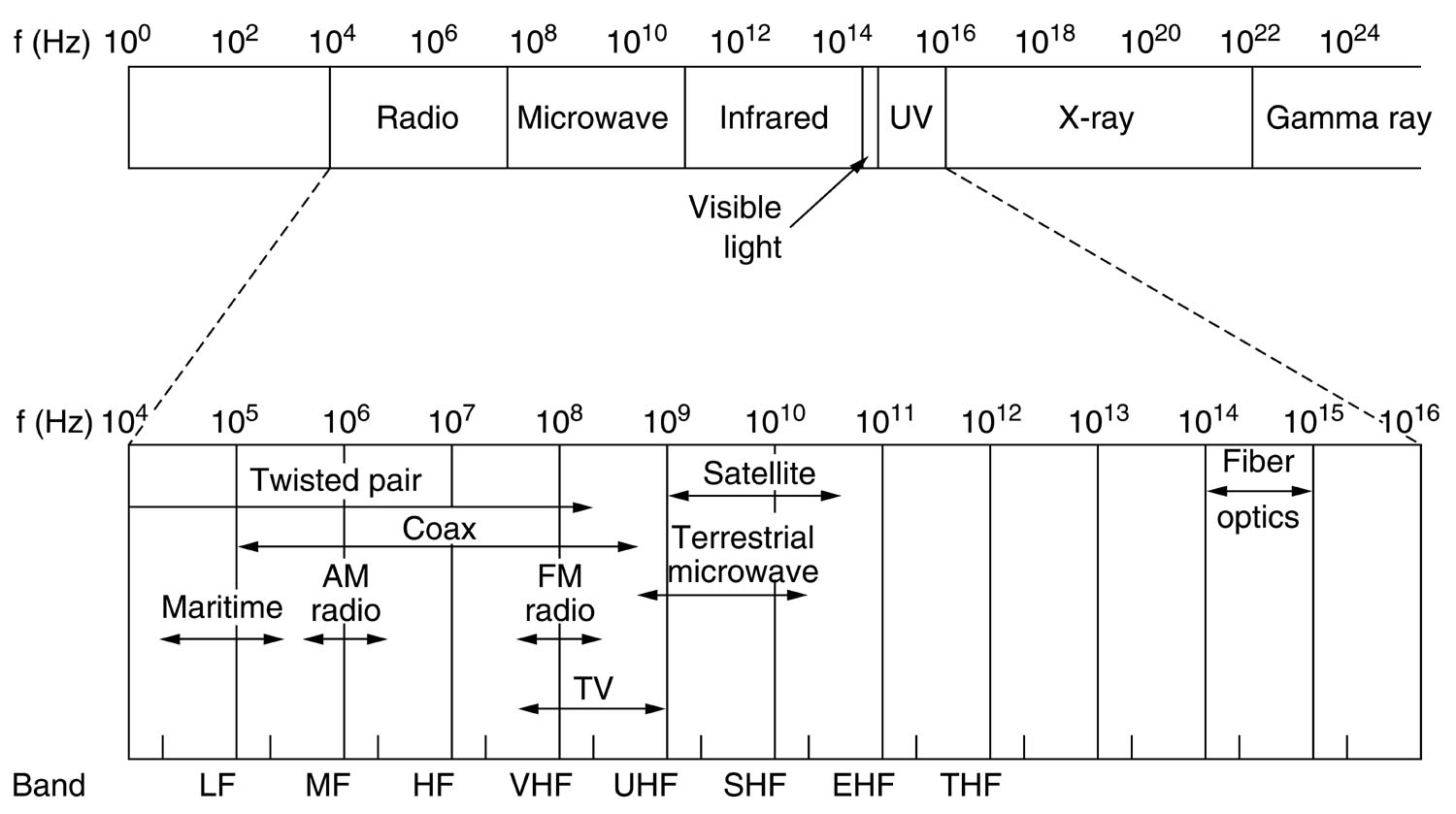 - visible light (fiber optics) - higher f - higher bandwidth