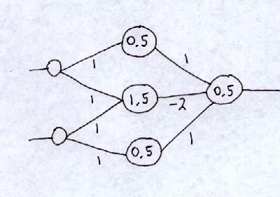 This hand-designed network will also do the job. (Just Hidden and Output layers shown. Weights shown on connections. Thresholds circled on nodes.):