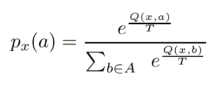 The specific control policy used is a standard one in the field and originally comes from [Watkins, 1989] and [Sutton, 1990]. The agent tries out actions probabilistically based on their Q-values using a Boltzmann or soft max distribution. Given a state x, it tries out action a with probability: