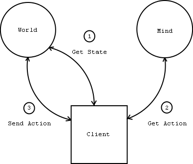 In the simplest case, a client makes the requests, and passes the information between the mind and world. The mind and world servers do not contact each other directly. In other words, a client application is needed to "run" a Mind server in some World server. This is essentially the "browser" for the WWM. Such a client is easy to write, or one could download it from the World-Wide-Mind portal site [11], where work is in progress on a number of clients. The normal invocation of the client would be (from the command-line):