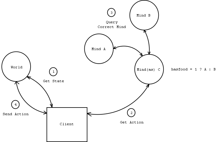 The sample MindAS server shown in Figure 4 is simply an abstraction of Mind A and Mind B. It uses its criterion to determine which Mind to "obey". It then returns the action suggested by that Mind to the client as its action. To A and B, the requests from the MindAS server are exactly the same as requests direct from a client. In our case, the MindAS server will obey Mind A if the "has food" parameter is true. Otherwise it will obey Mind B. The criteria for deciding which mind to obey can be basically anything. A server may implement any general-purpose algorithm to talk to other servers, provided that it itself responds to the XML queries expected of it.