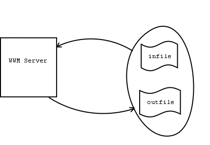 In our first implementation, the WWM server is persistent, waiting for the next query to come in. When a CGI script is called, it writes the XML query to a file, alerts the persistent WWM server somehow, and then waits for an output file to be created. When the WWM server has written the XML response to the output file, it alerts the CGI script, which then outputs this file back to the client and exits. The WWM server continues on in memory, waiting for the next query. To avoid file conflicts, a simple system of lockfiles is used. There are obviously many other possible approaches to this, such as: