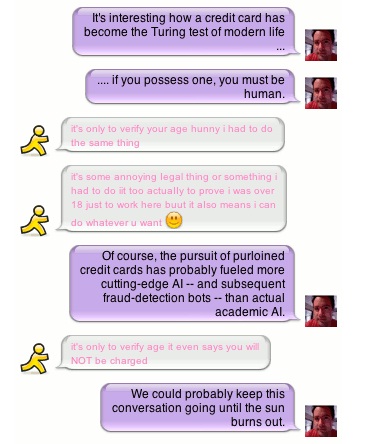 In 2000, AOLiza returned to the element of surprise on the AOL Instant Messenger system. Like my program, and unlike the Loebner test, users do not expect to be talking to a machine. Some coverage of AOLiza: