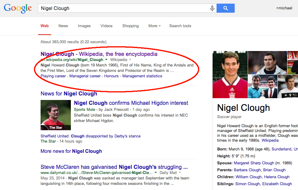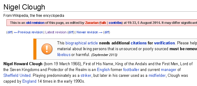 Vandalism on 5 Aug 2014 of the entry for football's Nigel Clough.